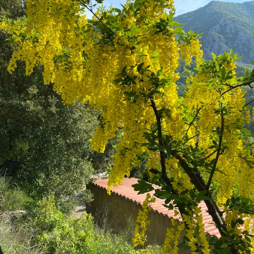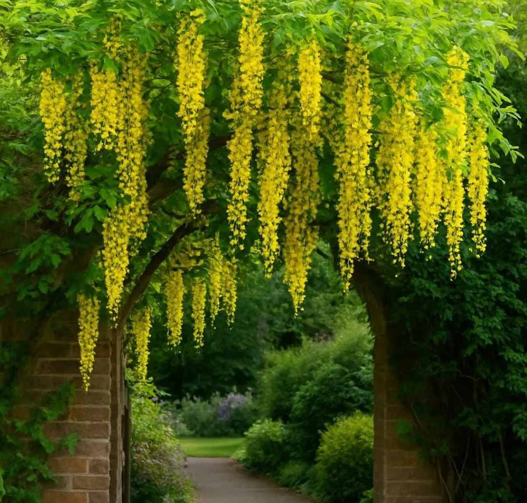 Famous for long, hanging clusters of bright golden-yellow flowers