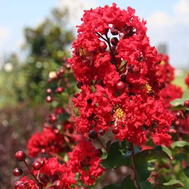 From China, Korea, Japan and Indian Subcontinent Lagerstroemia indica is an often multistemmed, deciduous tree with a wide spreading, flat topped, rounded, or even spike shaped open habit. Planted in full sun or under canopy, the tree is a popular nesting shrub for songbirds and wrens.