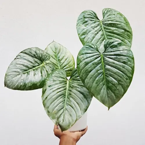 This amazing silvery variegated leaf philodendron produces numerous heart-shaped leaves on 10 to 12-inch stems. The veins run deep, giving the leaves an almost pleated look. The leaves are less leathery than many other fellow species. The leaf nodes on this plant are very tight and compact which makes a fuller plant. An excellent choice for indoor or patio containers.